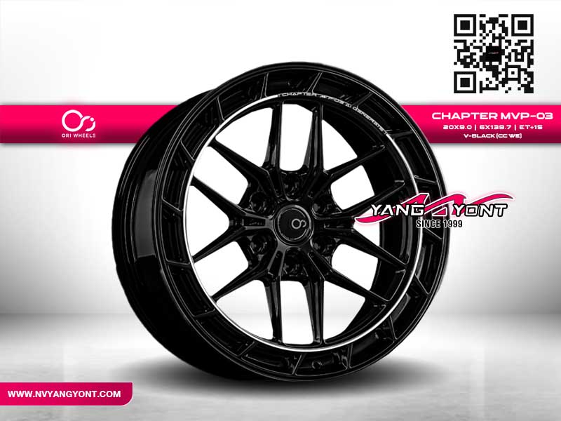 Ori Wheels Chapter MVP-03 ล้อแม็กแนวสปอร์ตพรีเมียม ขนาด 20x9.0 นิ้ว PCD 6x139.7 ออฟเซ็ต +15 รุ่นยอดนิยมที่มาในสีดำเงา (V-Black) พร้อมการเคลือบลายพิเศษ CC WE ให้ลุคดุดันและมีเอกลักษณ์เฉพาะตัว เหมาะสำหรับรถกระบะดัดแปลง ยกสูง PPV และ SUV ที่ต้องการทั้งความสวยงาม แข็งแรง และสมรรถนะในการขับขี่
